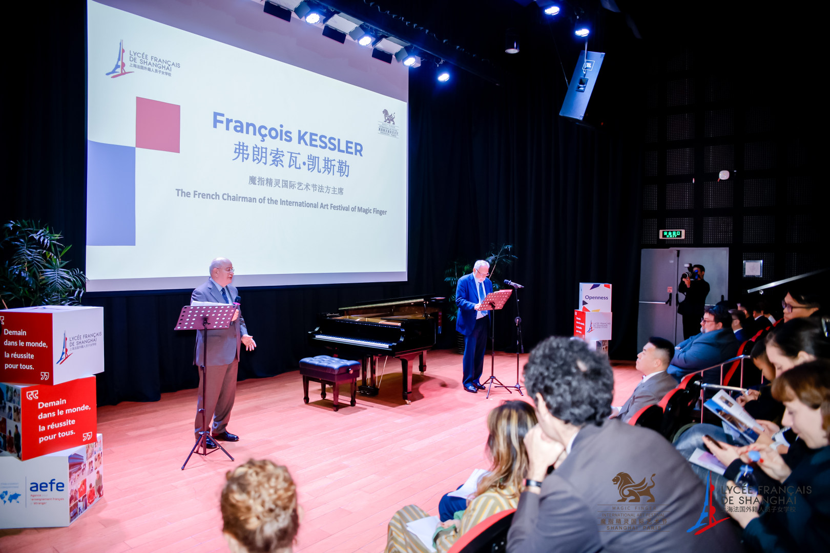 Ensuite, les invités d'honneur du festival, le Général François Kessler, Président français du "Festival international Magic Finger" et ancien Président de la Fondation Charles de Gaulle, et le Général François Torrès, Conseiller du festival et ancien attaché à l'Ambassade de France en République populaire de Chine, sont apparus pour donner une conférence passionnante intitulée "Général de Gaulle : Le fondateur du pont central de l'amitié franco - chinoise". Une présentation vivante et détaillée a permis aux spectateurs de comprendre profondément l'intelligence et le courage exceptionnels du Général de Gaulle dans la fondation du pont solide de l'amitié franco - chinoise. Ils ont également mieux compris l'histoire profonde et la signification du temps de la relation amicale entre la France et la Chine. Dans la partie de performance musicale, Tang Juechen, jeune pianiste des Magic Finger de Chine, et deux élèves talentueux de notre campus de Shanghai ont joué sur scène. L'art transcende les frontières. Leur exécution technique et leur charme artistique ont impressionné les spectateurs étrangers présents.