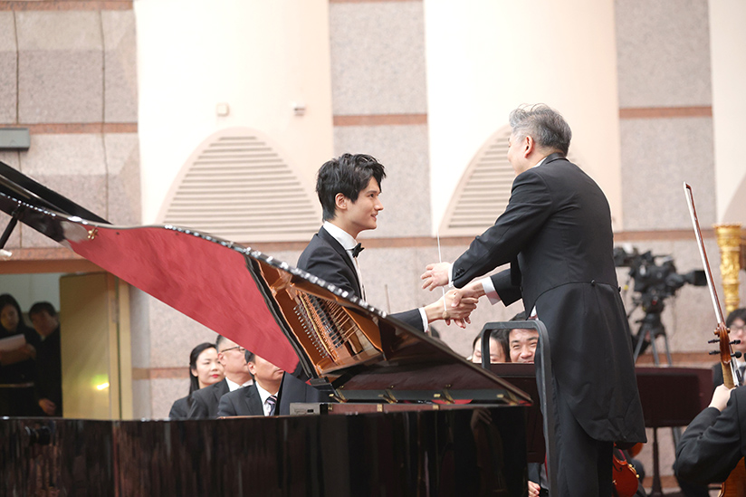 Xia Xiaotang, vice - président et chef d'orchestre permanent de l'Orchestre Philharmonique de Chine (à droite), Tang Juechen, Elfe Magic Finger de Chine et jeune pianiste (à gauche)